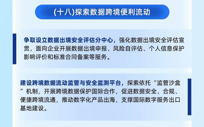 第四,探索數(shù)據(jù)跨境便利流動,爭取設立數(shù)據(jù)出境安全評估分中心,建設跨境數(shù)據(jù)流動監(jiān)管與安全監(jiān)測平臺。