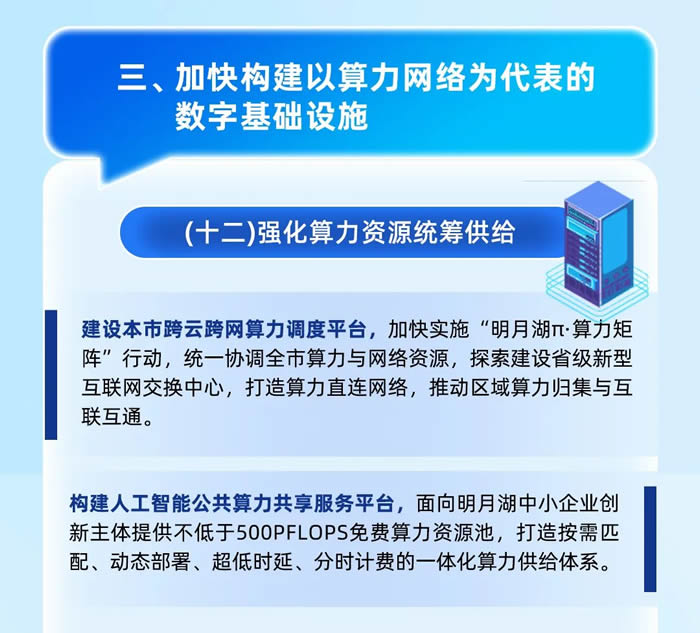 明月湖還將加快構(gòu)建以算力網(wǎng)絡為代表的數(shù)字基礎設施,包括強化算力資源統(tǒng)籌供給,建設本市跨云跨網(wǎng)算力調(diào)度平臺,構(gòu)建人工智能公共算力共享服務平臺。