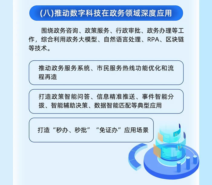 政務領域?qū)⑼苿诱辗障到y(tǒng)、市民服務熱線功能優(yōu)化和流程再造;打造政策智能問答、信息精準推送、事件智能分撥、智能輔助決策、數(shù)據(jù)智能匹配等典型應用;打造“秒辦、秒批”“免證辦”應用場景。