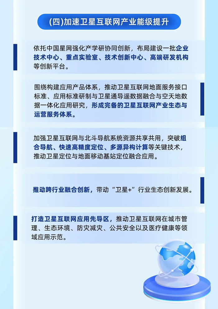 在較受關(guān)注的衛(wèi)星互聯(lián)網(wǎng)產(chǎn)業(yè)方面,將布局建設一批企業(yè)技術(shù)中心、重點實驗室、技術(shù)創(chuàng)新中心、高端研發(fā)機構(gòu)等創(chuàng)新平臺,形成完備的衛(wèi)星互聯(lián)網(wǎng)產(chǎn)業(yè)生態(tài)與運營服務體系,突破組合導航、快速高精度定位、多源異構(gòu)計算等關(guān)鍵技術(shù),推動跨行業(yè)融合創(chuàng)新,打造衛(wèi)星互聯(lián)網(wǎng)應用先導區(qū)。