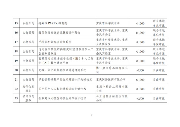 項目主要包括:智能網聯新能源汽車5項,由長安汽車公司等單位提出,重點解決自動駕駛操作系統等重要技術問題。先進材料6項,由再升科技公司等單位提出,重點解決耐高溫中高效過濾紙等重要技術問題。智能裝備2項,由重慶市科技局等單位提出,重點解決國產化氫基豎爐裝備等重要技術問題。生物醫藥8項,由重慶金鳳實驗室等單位提出,重點解決抗腫瘤抗體藥物等重要技術問題。軟件信息服務3項,由中科云從公司等單位提出,重點解決人工智能模型訓練等重要技術問題。綠色低碳2項,由中石化涪陵頁巖氣公司等單位提出,重點解決二氧化碳封存等重要技術問題。功率半導體2項,由重慶市科技局提出。