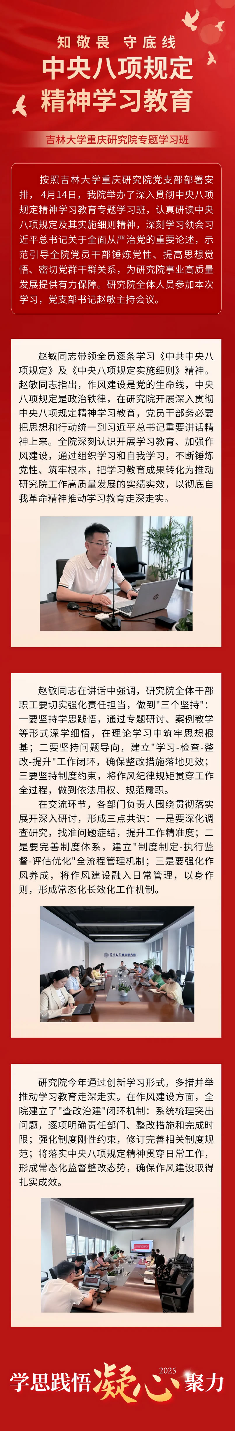 新聞中心 以吉林大學科研力量助推重慶產業高質量發展 我院要聞通知公告 主題教育學習 | 吉林大學重慶研究院黨支部召開深入貫徹中央八項規定精神學習教育專題學習班 時間:2025-04-14發布:吉大研究院 上一篇:研究院5周年 | 萌娃探秘吉林大學重慶研究院——與機器狗握手、開卡丁車嗨翻天! 下一篇:研究院5周年 | 5年·20記,最好的成果,叫「我們」 返回列表