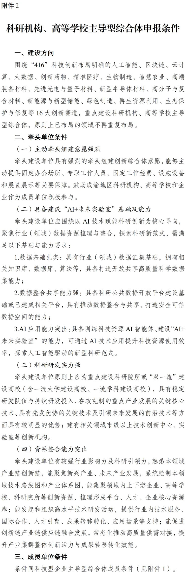(一)請有申報意愿且符合條件的牽頭單位填寫《重慶市產業創新綜合體建設項目申報書》(附件3)和《2025年重慶市產業創新綜合體申報基本情況簡表》(附件4),于2025年10月23日(星期四)18:00前將紙質件(A4紙雙面打印、裝訂成冊并加蓋公章,一式五份)和電子件(光盤刻錄,文件名為“綜合體名稱+牽頭單位名稱”)報送至所在區縣經信、科技部門。科技型企業主導型綜合體需登錄網站進行在線申報,網址:https://cx-cqfund.jjxxw.cq.gov.cn/login。科研機構、高等學校主導型綜合體需將電子版資料發送至電子郵箱:yangw490@163.com。